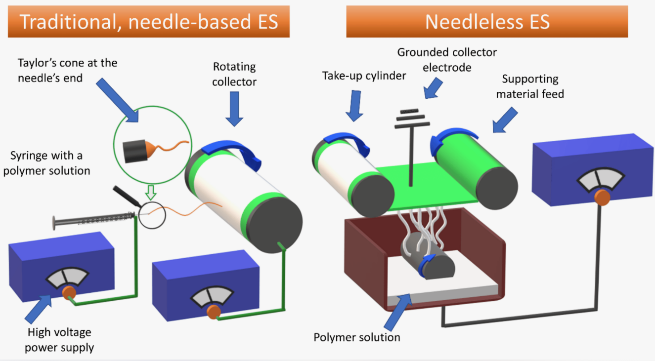 This technique works thanks to the electric field created between a needle (metal capillary) and a conductive surface. As shown in the image to the right, spray the material you want to create in the nano/microfiber through a needle with tension on the tip. A substance charged positively by the voltage on the needle is attracted to the negatively charged conductive surface at the opposite end. The materials, which are placed on the conductive surface in the form of fibers, ultimately form the fabric framework. Although the basis of this technique dates back to the 1930s, it evolved into its current form in the 1960s.